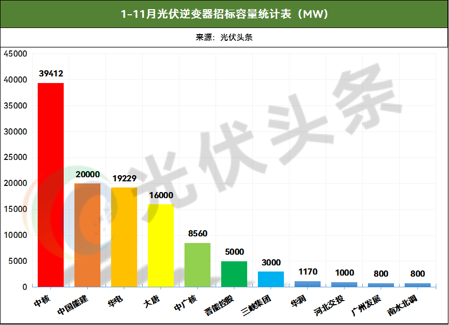 光伏头条通过分析发现1-11月央国企招标中,光伏逆变器招投标市场呈现如下趋势和特点: