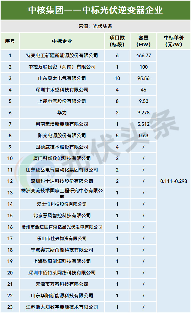 中核集团有44个项目定标,合计容量39.61GW。特变电工、禾望电气、上能电气、华为、阳光电源、固德威、科华数能、科士达、中车时代电气(株洲变流)等23家企业成为最大赢家。