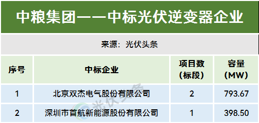 1月8日,中粮集团旗下新疆鸿泰新能源投资有限公司2025年-2026年关于组串式逆变器三个标段确定了中标候选人,北京双杰电气股份有限公司与首航新能最终中标。