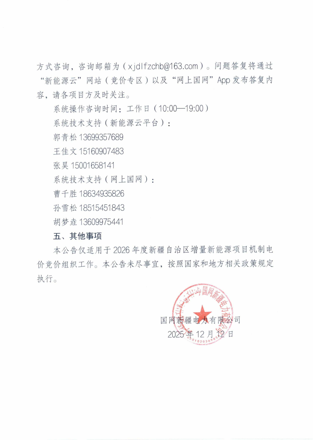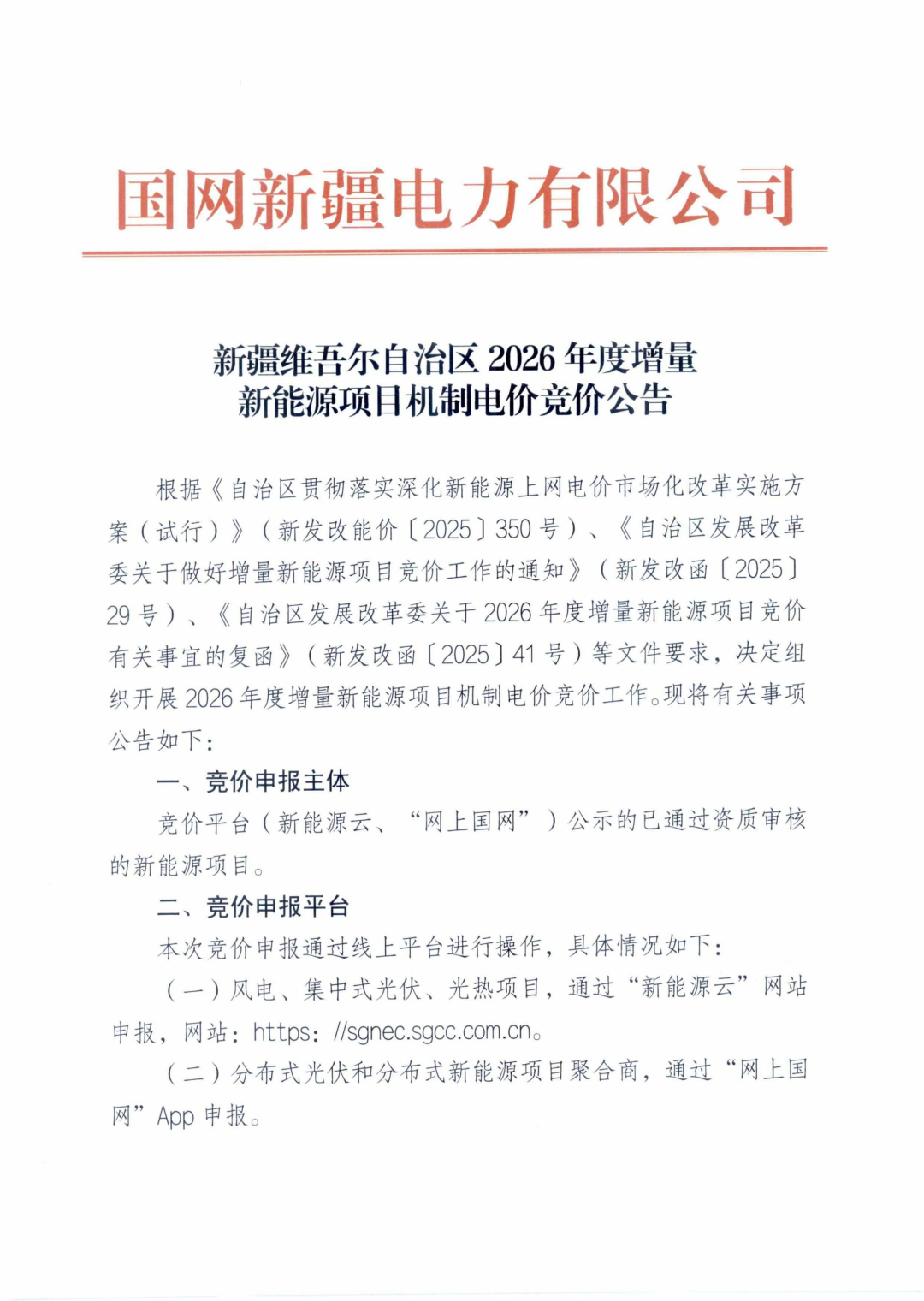 储能与电力市场获悉,12月12日,国网新能源云发布新疆维吾尔自治区2026年度增量新能源项目机制电价竞价公告。
