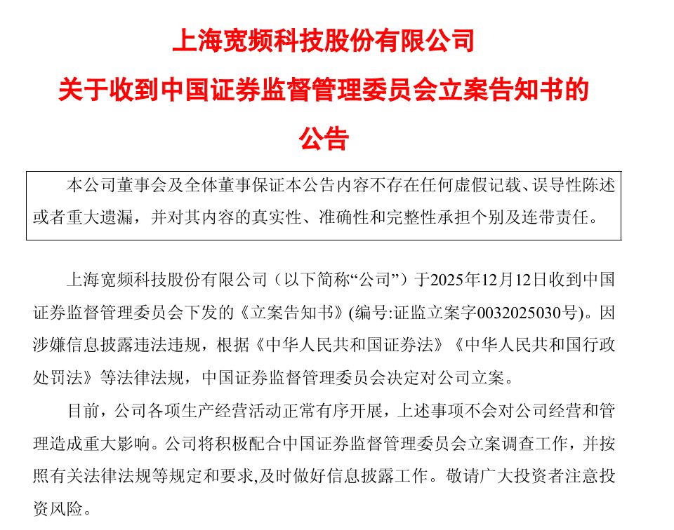12月12日,*ST沪科(600608.SH,股价3.81元,市值12.53亿元)公告称,公司于当日收到中国证券监督管理委员会下发的《立案告知书》,因涉嫌信息披露违法违规,中国证券监督管理委员会决定对公司立案。目前公司生产经营正常,该事项不会对公司经营和管理造成重大影响。公司将积极配合调查工作并按照相关法律法规要求及时做好信息披露工作。