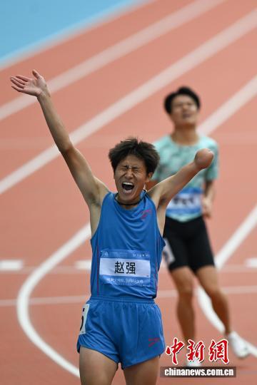 12月12日,全国第十二届残疾人运动会暨第九届特殊奥林匹克运动会田径项目在位于广州的广东奥林匹克体育中心继续开展,内蒙古队赵强在男子400米T47级决赛中夺冠。图为赵强在夺冠时挥手庆祝。中新社记者 陈楚红 摄