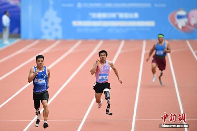 12月12日,全国第十二届残疾人运动会暨第九届特殊奥林匹克运动会田径项目在位于广州的广东奥林匹克体育中心继续开展,山东队李茂大在男子400米T63级决赛中夺冠。图为李茂大(左一)在比赛中。中新社记者 陈楚红 摄