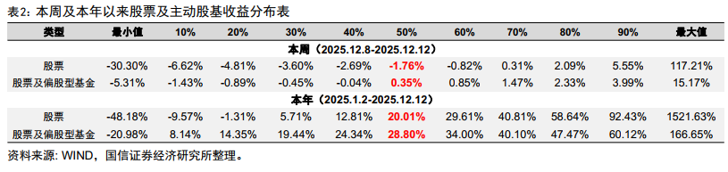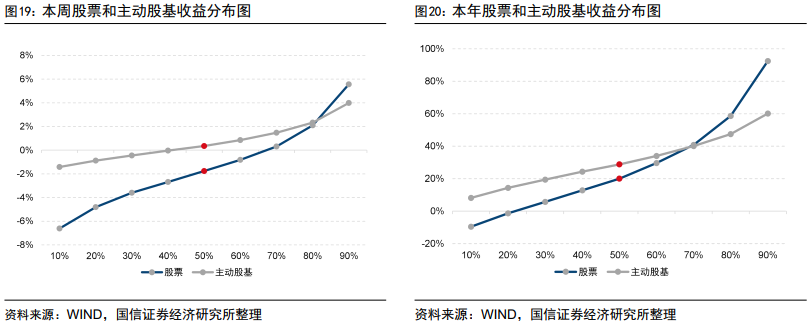 图19和图20展示了全部A股股票(剔除上市不满半年的新股及ST股)、主动股基在本周及本年的收益率分布图,描述了不同分位点下的资产收益率。