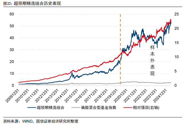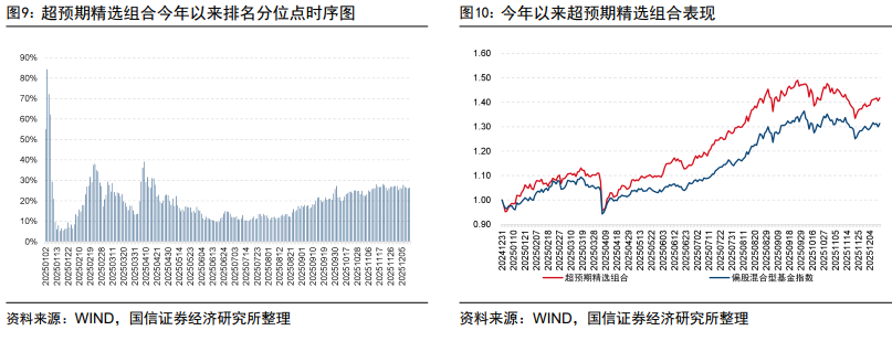 图9展示了超预期精选组合本年以来在主动股基中的排名分位点时间序列图。图10展示了今年以来超预期精选组合与偏股混合型基金指数的净值走势。本年偏股混合型基金指数收益率31.34%,超预期精选组合收益率41.78%。