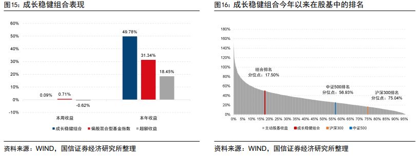 本周,成长稳健组合绝对收益0.09%,相对偏股混合型基金指数超额收益-0.62%。本年,成长稳健组合绝对收益49.78%,相对偏股混合型基金指数超额收益18.45%。今年以来,成长稳健组合在主动股基中排名17.50%分位点(607/3469)。