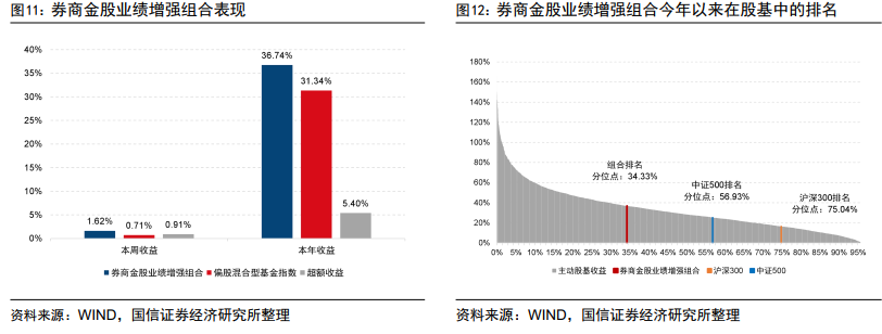 本周,券商金股业绩增强组合绝对收益1.62%,相对偏股混合型基金指数超额收益0.91%。本年,券商金股业绩增强组合绝对收益36.74%,相对偏股混合型基金指数超额收益5.40%。今年以来,券商金股业绩增强组合在主动股基中排名34.33%分位点(1191/3469)。