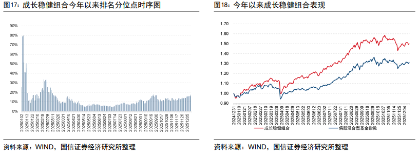 图17展示了成长稳健组合本年以来在主动股基中的排名分位点时间序列图。图18展示了今年以来成长稳健组合与偏股混合型基金指数的净值走势。本年偏股混合型基金指数收益率31.34%,成长稳健组合收益率49.78%。
