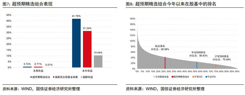 本周,超预期精选组合绝对收益0.72%,相对偏股混合型基金指数超额收益0.01%。本年,超预期精选组合绝对收益41.78%,相对偏股混合型基金指数超额收益10.44%。今年以来,超预期精选组合在主动股基中排名26.58%分位点(922/3469)。