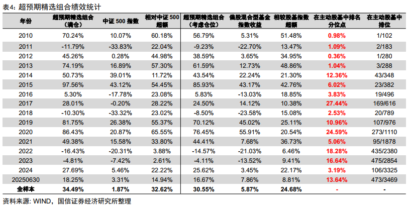 在2010.1.4-2025.6.30区间内,超预期精选组合,满仓状态考虑交易费用后,组合年化收益34.49%,相对中证500指数超额收益32.62%。考虑仓位及交易费用的影响后,组合年化收益达到30.55%,相较偏股混合型基金指数年化超额24.68%,在2010年以来,组合每年的业绩排名都排在股基的前30%。