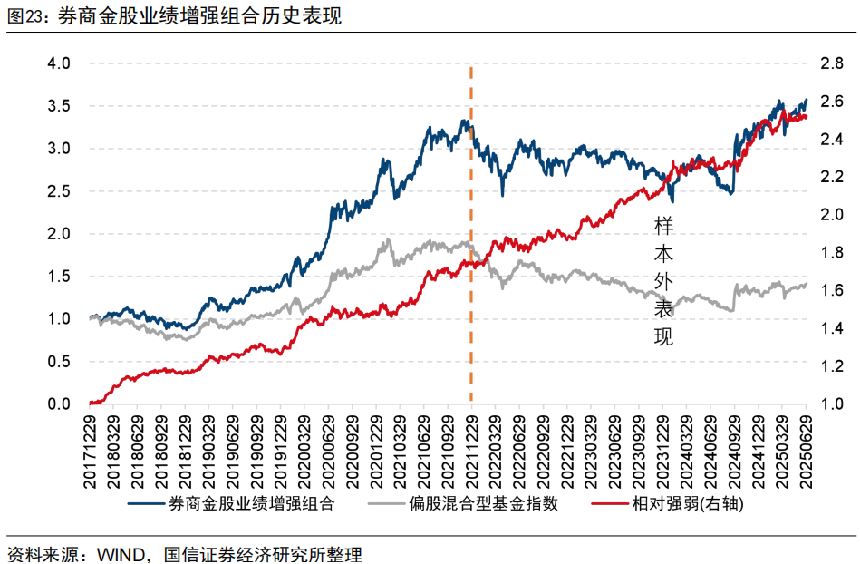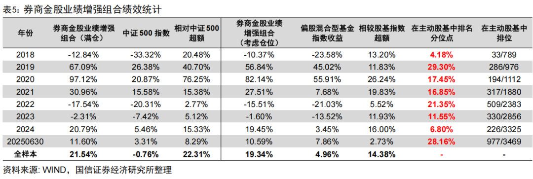 在2018.1.2-2025.6.30区间段内,券商金股业绩增强组合,考虑仓位及交易费用的影响后,组合年化收益为19.34%,相对偏股混合型基金指数年化超额14.38%,在2018年-2025年期间,组合每年的业绩排名都排在主动股基前30%的水平。