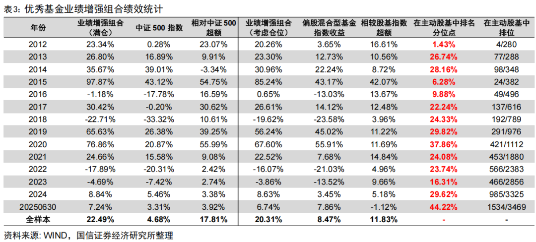 在2012.1.4-2025.6.30区间内,优秀基金业绩增强组合考虑仓位及交易费用的影响后,组合年化收益达到20.31%,相较偏股混合型基金指数年化超额11.83%,在2012年以来,组合大部分年度业绩排名都排在股基的前30%。