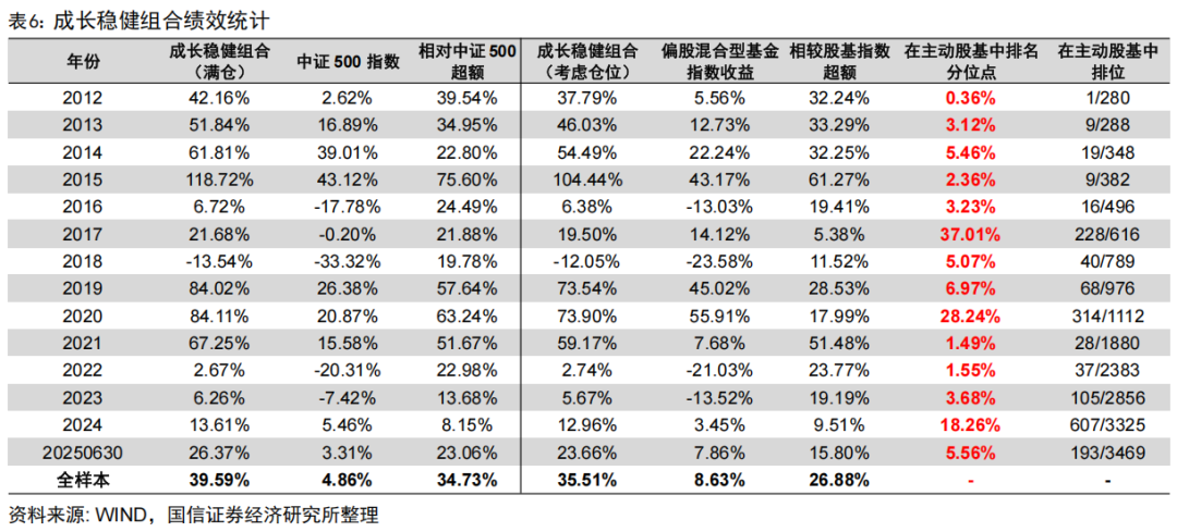 在2012.1.4-2025.6.30区间段内,成长稳健组合满仓状态考虑交易费用后,组合年化收益39.59%,相对中证500指数超额收益34.73%。考虑仓位及交易费用的影响后,组合年化收益达到35.51%,相较偏股混合型基金指数年化超额26.88%,在2012年以来,组合各年度业绩排名基本都排在股基的前30%。
