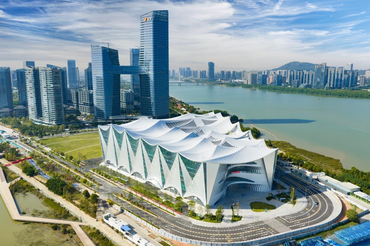 大湾区科学会堂位于广州南沙明珠湾区灵山岛尖,以“千帆竞渡,科技远航”为设计理念,建筑面积约9.26万平方米,集学术中心、科技馆与配套功能于一体。中国铁建地产项目工程经理张保童表示,“我们从结构、材料到运维进行全链条科技创新,将科学会堂打造成国际一流的科学论坛载体。”