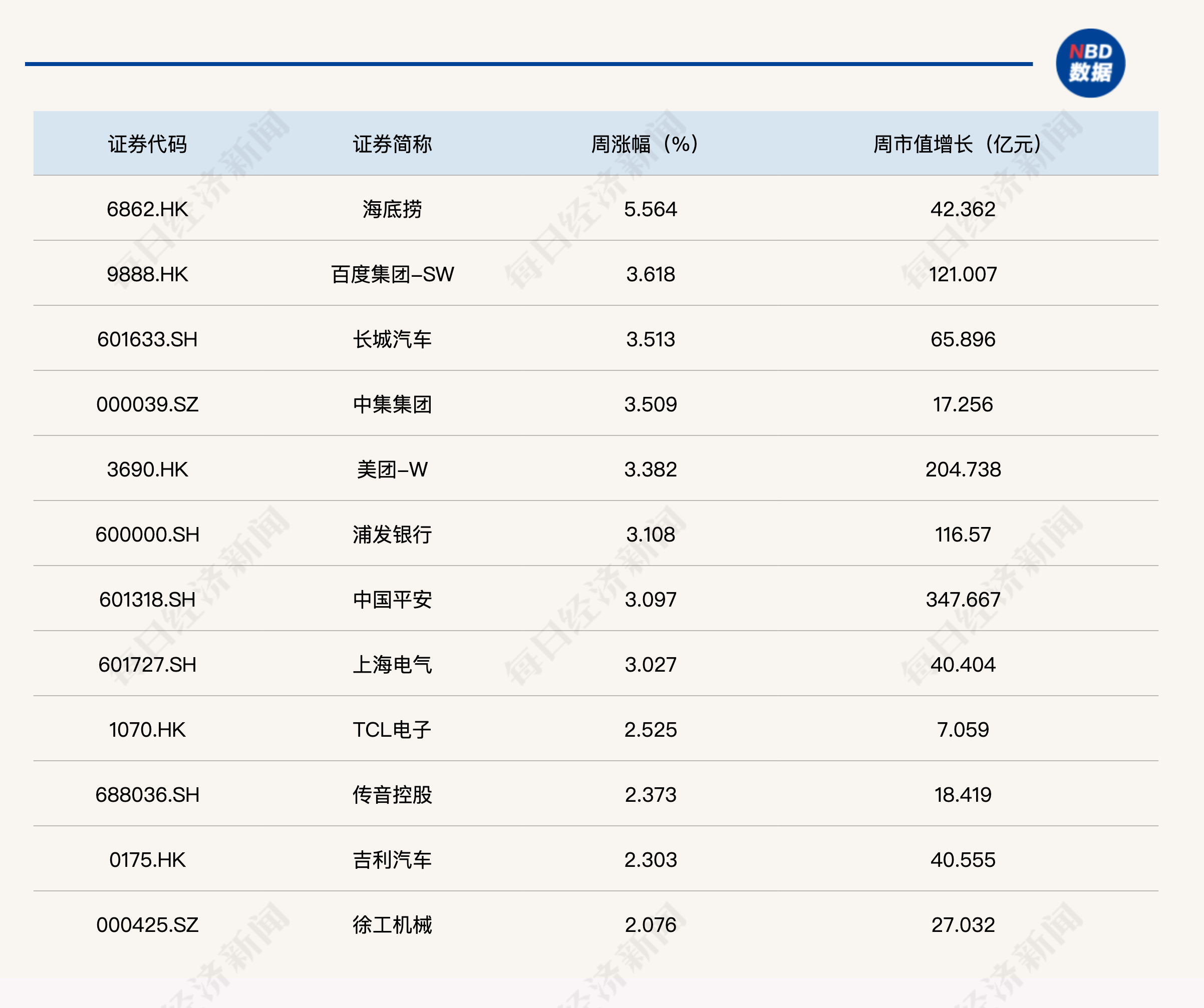 从本周每经品牌100指数成分股表现来看,除海底捞周涨幅超过5%以外,还有多只成分股涨幅突破3%。其中,百度集团-SW、长城汽车、中集集团的周涨幅超过3.5%。