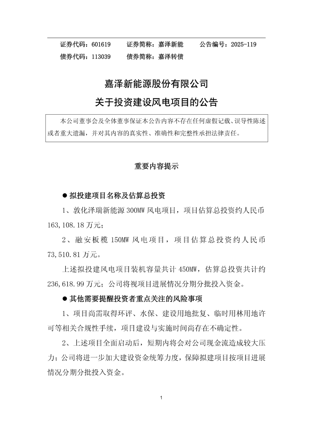 风芒能源获悉,12月14日,嘉泽新能公告称,公司拟投建两个风电项目,其中,敦化泽瑞新能源300MW风电项目,该项目建设单位为公司三级子公司敦化泽瑞新能源有限公司,项目估算总投资约16.31亿元;融安板榄150MW风电项目,该项目建设单位为公司二级控股子公司柳州博阳广能新能源有限公司,项目估算总投资约7.35亿元。