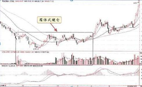 2、箱体式建仓:庄家用这种方式建仓,股价走势往往表现为长期在一个箱体内上下波动,当股价上升至某一高点,盘中就会出现抛盘令股价回落,而一旦股价跌到某一低点,盘中即有买盘介入令股价回升。