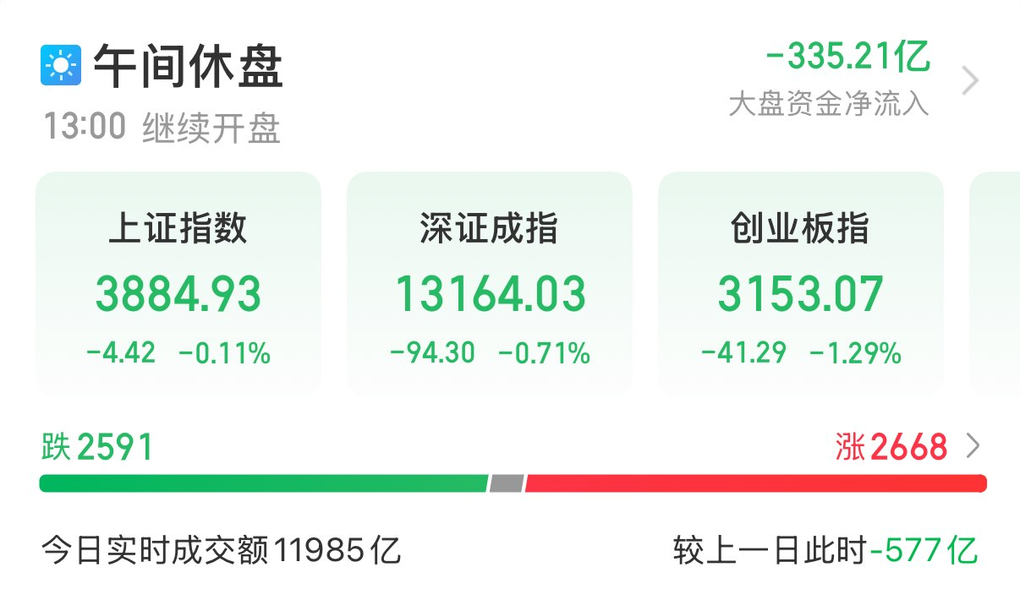 截至午盘,上证指数跌0.11%,深证成指跌0.71%,创业板指跌1.29%,北证50跌0.36%。全市场成交额11985亿元,较上日成交额缩量577亿元。