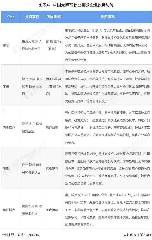 从中国无障碍产业代表性企业的对外投资来看,主要是政策端《无障碍环境建设法》及地方补贴形成支撑,如多地市政改造专项投入,需求端老龄化与残障群体需求释放刚性市场,推动产业链企业加大对外投资。投资聚焦智能辅具、信息无障碍、适老化改造等赛道,AI、物联网融合项目受青睐,vivo 等科技企业加码资金与技术投入。参与者涵盖科技巨头、专业厂商及政府采购,虽市场分散,但细分领域增速显著,头部企业通过研发与场景落地构建优势,行业投资逐步向高附加值、技术密集型方向倾斜。无障碍产业代表性企业最新投资动向如下: