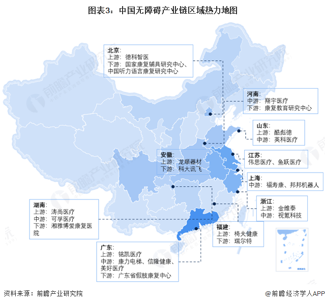 无障碍全国产业链最完善的是广东地区,上游有相关康复器械零部件制造商和材料商,可以提供定制化的无障碍产品,中游有康力电梯、信隆健康和美好医疗等企业,市场经验丰富,下游有广东省假肢康复中心等康复机构,产业链企业相互协作。其次是江苏、浙江、安徽、上海一带,有相关先进材料供应商和软硬件制造商,此外山东、河南、湖南等人口密集省份产业配套齐全。