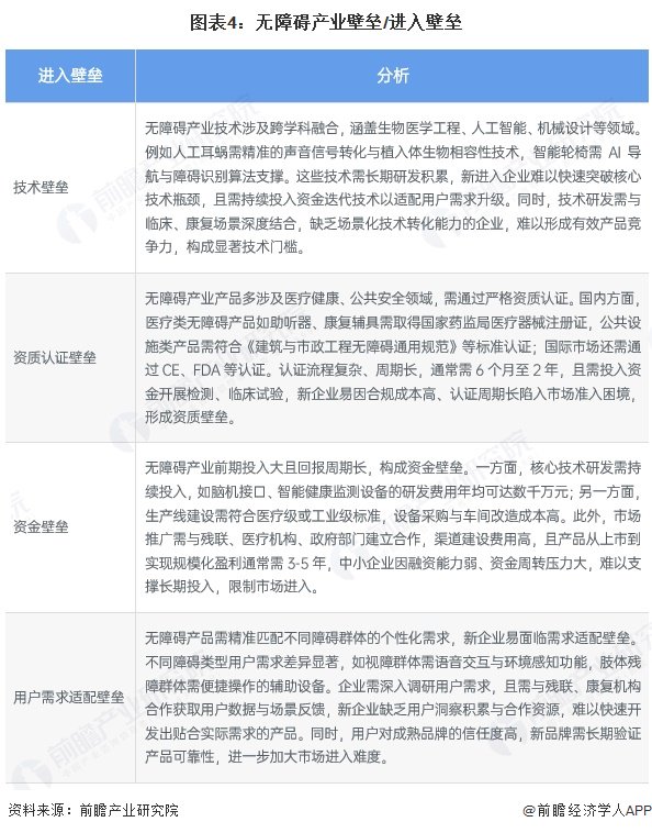 无障碍市场的进入壁垒主要体现在技术、资质认证、资金、用户匹配等方面,无障碍产业技术涉及跨学科融合,涵盖生物医学工程、人工智能、机械设计等领域。无障碍产业产品多涉及医疗健康、公共安全领域,需通过严格资质认证。无障碍产业前期投入大且回报周期长,构成资金壁垒。一方面,核心技术研发需持续投入,如脑机接口、智能健康监测设备的研发费用年均可达数千万元;另一方面,生产线建设需符合医疗级或工业级标准,设备采购与车间改造成本高。无障碍产品需精准匹配不同障碍群体的个性化需求,新企业易面临需求适配壁垒。