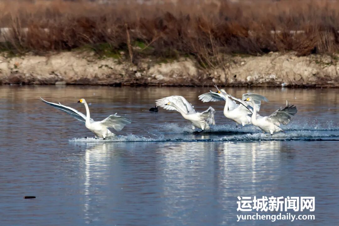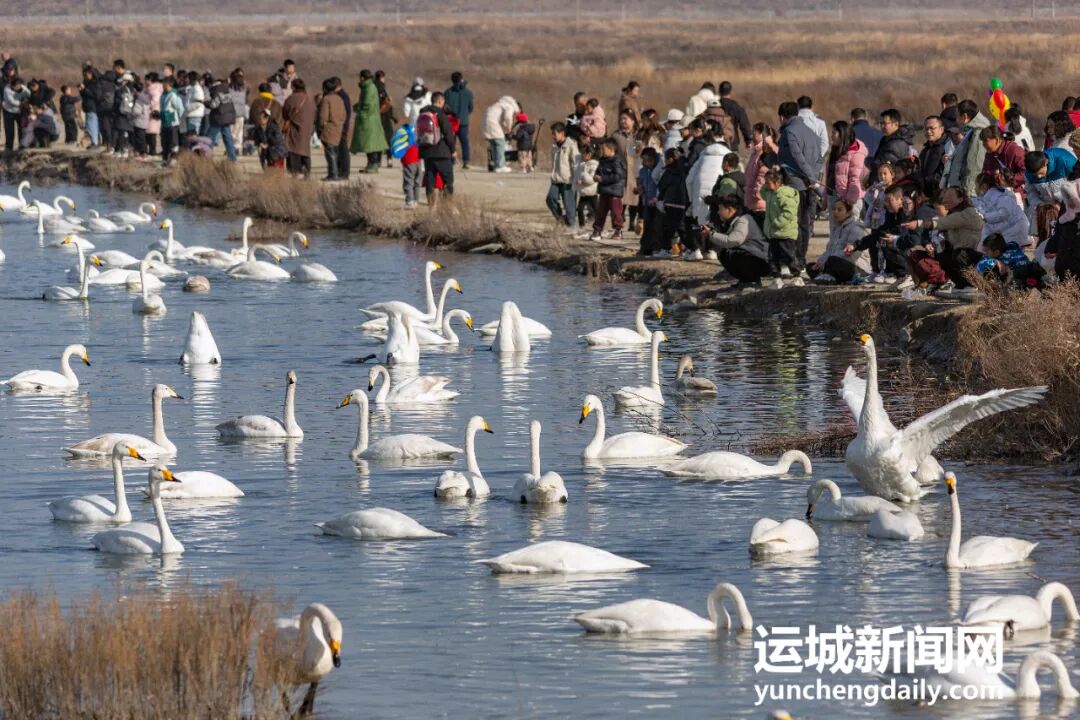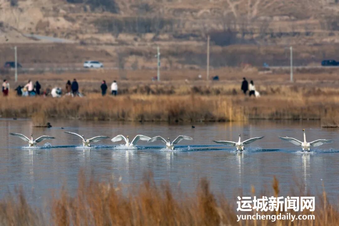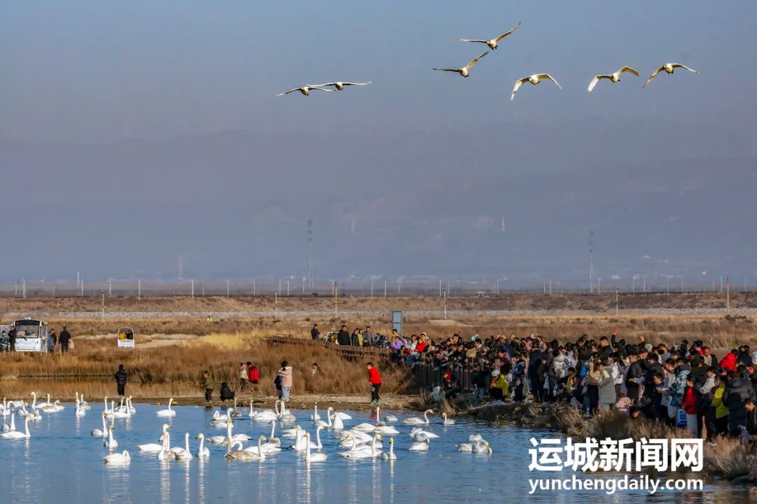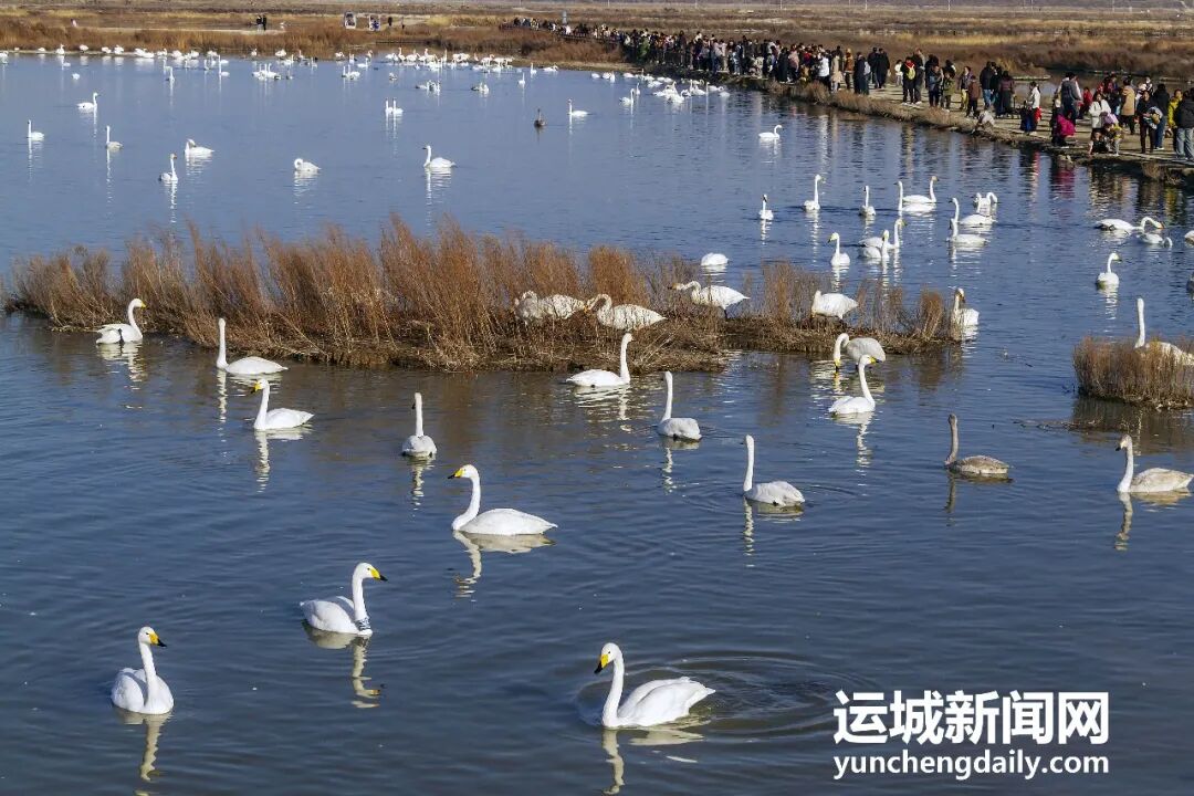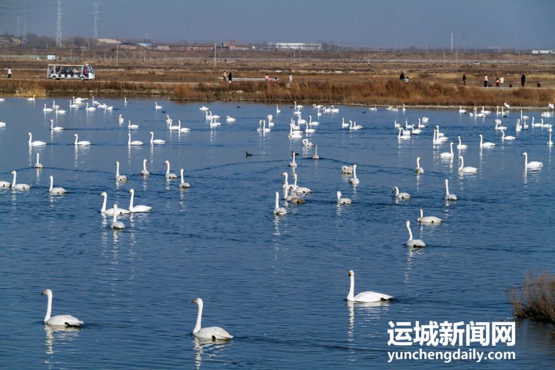 寒气来袭,千余只飞抵运城盐湖湿地越冬的天鹅,时而嬉戏、时而飞翔,时而觅食,成为千年盐湖一道人与自然和谐共舞的生态画卷,吸引众多游客前来观赏游玩。