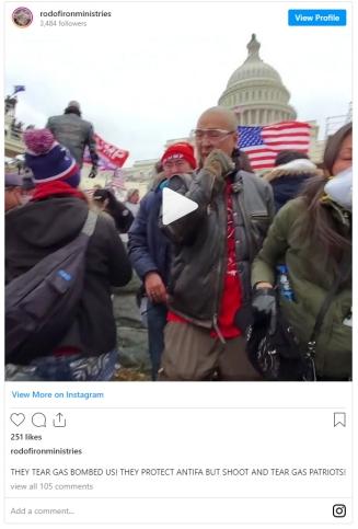 2021年1月6日,特朗普的支持者暴力闯入国会大厦,造成6人死亡。“圣所教堂”的Instagram账号显示,文亨进当天出现在国会山。