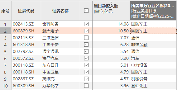 上证报中国证券网讯(记者 徐蔚)Choice数据显示,12月15日,资金净流入额前十的个股为雷科防务、航天电子、三维通信、中国平安、通宇通讯、海马汽车、东方日升、中国卫星、英维克、万华化学。其中雷科防务和航天电子净流入额均超10亿元。