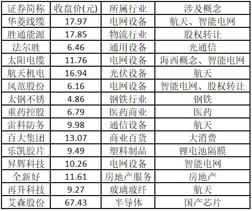 涨停板个股中,股价创出近一年新高的个股有15只(不包括创出历史新高的个股),包括华菱线缆、胜通能源、法尔胜、太阳电缆、航天机电、风范股份、太钢不锈、重药控股、雷科防务、百大集团、乐凯胶片、昇辉科技、全新好、再升科技、艾森股份,具体如下表所示。