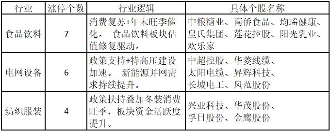 从行业特征来看,今日涨停板个股中,食品饮料、电网设备、纺织服装行业的个股最多。