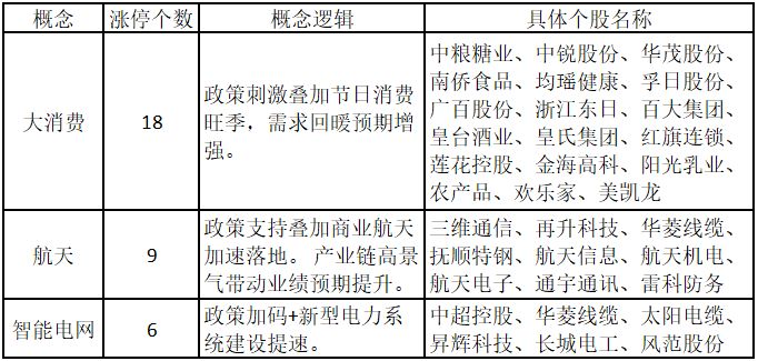从概念特征来看,今日涨停板个股中,大消费、航天、智能电网概念的个股最多。