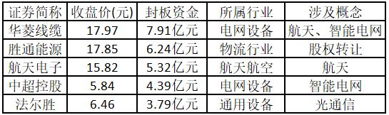 从封板资金来看,今日涨停板个股中,封板资金排名前5的个股包括华菱线缆、胜通能源、航天电子、中超控股、法尔胜。