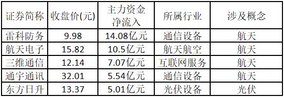 从主力资金来看,今日涨停板个股中,主力资金净流入金额排名前5的个股分别为雷科防务、航天电子、三维通信、通宇通讯、东方日升。