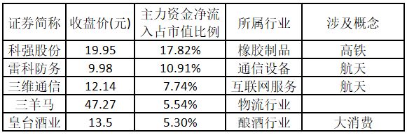 主力资金净流入金额占市值比例排名前5的个股分别为科强股份、雷科防务、三维通信、三羊马、皇台酒业。欢迎大家关注微信公众号“道达号”,其“道达涨停复盘”栏目为大家解读。