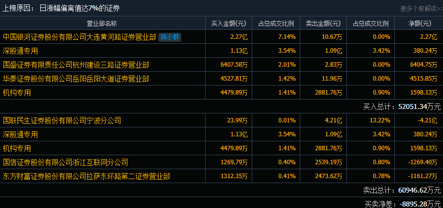 通宇通讯(002792)今日涨10.00%,成交额31.87亿元,换手率30.36%,盘后龙虎榜数据显示,深股通专用席位买入1.13亿元并卖出1.09亿元,1家机构专用席位净买入1598.13万元。陈小群席位净买入2.27亿元。