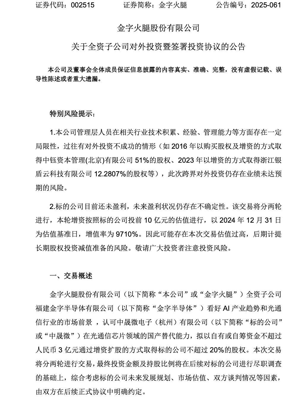 金字火腿表示,“本次对外投资是基于公司整体发展战略,能够更高效、充分地利用闲置资金,顺应数字经济时代的发展趋势,为公司未来业务提升提供更好发展机遇。”