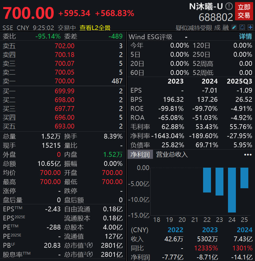 沐曦股份今日登录科创板,开盘大涨568.83%报700.00元,总市值2801亿元。