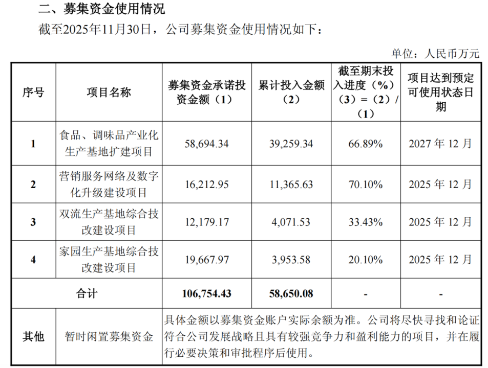 具体来说,就是天味食品2020年通过非公开发行股票的方式募集了16.22亿元资金净额,计划用于“食品、调味品产业化生产基地扩建项目”“营销服务网络及数字化升级建设项目”“双流生产基地综合技改建设项目”“家园生产基地综合技改建设项目”等四个项目的建设。截至2025年11月30日,这个项目承诺投入总额10.68亿元,但实际投入5.87亿元,尚有4.81亿元缺口。