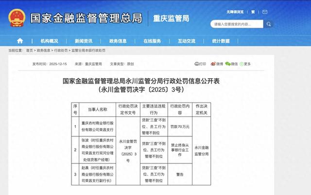 12月15日,国家金融监督管理总局永川监管分局披露一则行政处罚信息,渝农商行荣昌支行因内控管理问题被处以70万元罚款。