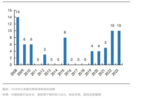 转机出现在2019年,那一年中国重启了新核电机组的审批。此后,核电建设进入爆发期,审批节奏不断提速,核准机组的数量井喷式爆发:2019年4台,2020年4台,2021年5台,2022年10台,2023年10台,2024年11台……