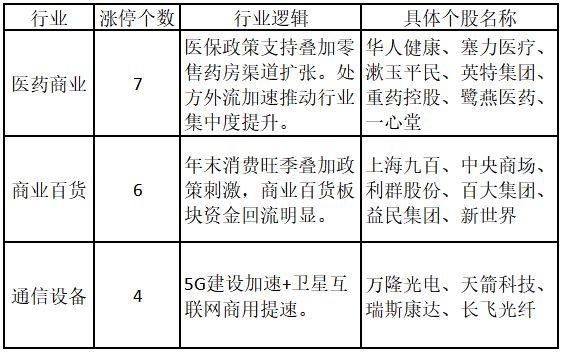 从行业特征来看,今日涨停板个股中,医药商业、商业百货、通信设备行业的个股最多。