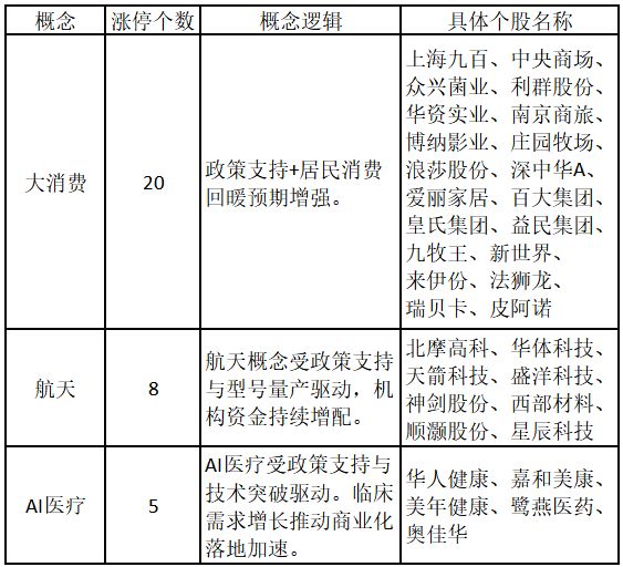 从概念特征来看,今日涨停板个股中,大消费、航天、AI医疗的个股最多。