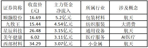 从主力资金来看,今日涨停板个股中,主力资金净流入金额排名前5的个股分别为顺灏股份、九牧王、星辰科技、美年健康、西部材料。