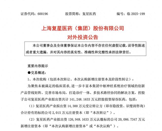 12月15日,上海复星医药(集团)股份有限公司发布公告,宣布控股子公司复星医药产业拟出资约14.12亿元人民币,控股收购绿谷(上海)医药科技有限公司。