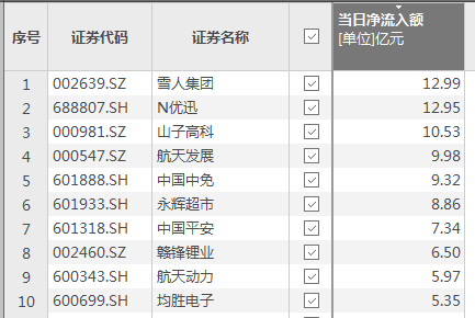 上证报中国证券网讯(记者 李雨琪)Choice数据显示,12月19日,资金净流入额排名前十的个股依次是雪人集团、N优迅、山子高科、航天发展、中国中免、永辉超市、中国平安、赣锋锂业、航天动力、均胜电子。其中,优迅股份上市首日获净流入12.95亿元。