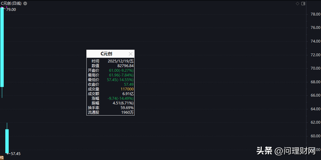 数据显示,12月18日C元创(001325)上市首日以79元/开盘,即为当日最高价,涨幅高达219.19%,当日报收67.23元,涨幅缩窄至171.64%,全天成交超11亿元……