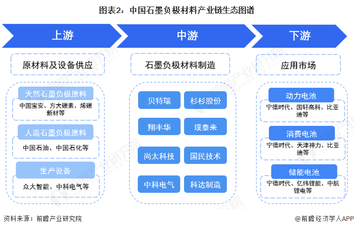 上游原材料供应商主要中国石化、中国石油、中国宝安等,设备供应商包括众大智能、中科电气等;中游石墨负极材料制造商主要包括贝特瑞、杉杉股份等;下游各类型电池生产企业包括比亚迪、宁德时代等。
