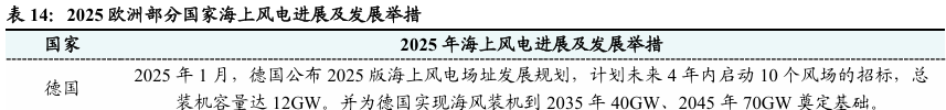 英国海风是海外市场的重点。1)欧洲风电装机集中度较高。截至2024年底,欧洲累计风电装机容量排名前六的国家分别为德国(72.7GW)、英国(31.6GW)、西班牙(31.2GW)、法国(24.4GW)、瑞典(17.2GW)、土耳其(13.8GW),上述六个国家的风电装机占欧洲风电总装机容量的67%。2)欧洲海风中,英国累计装机占比接近一半。截至2024年底,欧洲海上风电累计装机容量为36.66GW,其中英国15.9GW、德国9.12GW、荷兰4.74GW,其他主要国家包括丹麦、法国等,英国海风在欧洲市场的占比高达43%,海风累计装机容量位居欧洲第一。3)新增海风装机中,英国同样表现优秀。2024年英国新增海风装机容量为1.2GW,新增装机容量位居欧洲第一;德国和法国次之,2024年新增海风装机容量分别为730MW和658MW。