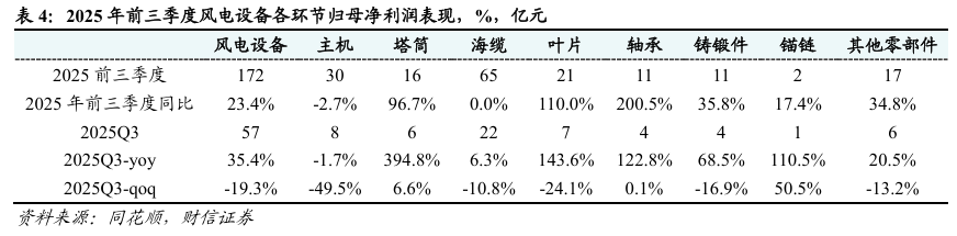 利润端同步改善,塔筒、叶片和轴承环节表现亮眼。风电设备:2025前三季度归母净利润172亿,同比+23.4%,其中Q3归母净利润57亿,同比+35.4%,环比-19.3%。分环节来看,塔筒:2025前三季度归母净利润16亿,同比+96.7%,其中Q3归母净利润6亿,同比+394.8%,环比+6.6%。叶片:2025前三季度归母净利润21亿,同比+110.0%,其中Q3归母净利润7亿,同比+143.6%,环比-24.1%。轴承:2025前三季度归母净利润11亿,同比+200.5%,其中Q3归母净利润4亿,同比+122.8%,环比+0.1%。主机环节的利润并没有得到明显改善,我们认为主要是今年交付的是去年的低价中标订单,导致主机环节增收不增利。