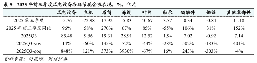 经营性现金流明显改善。风电设备:2025前三季度经营活动性净现金流-5.76亿,同比+96%,其中Q3经营活动性净现金流85.48亿,同比+14%,环比+848%。分环节来看,除轴承以外,其余环节的经营性现金流在2025年前三季度同比均有较大幅度的增长。